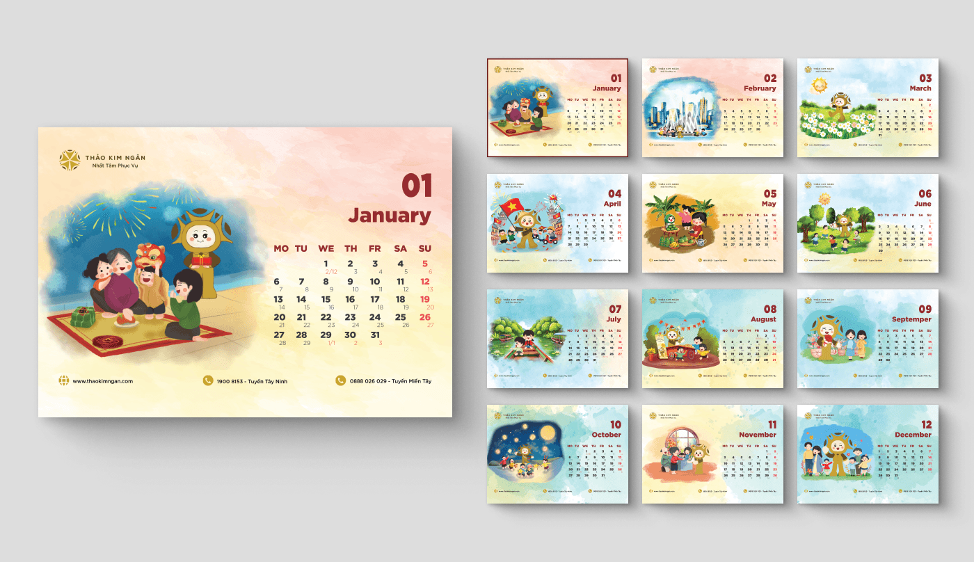 This calendar is a vivid picture of the special festival seasons of Vietnam. The year begins with the jubilant, warm atmosphere of Tet Nguyen Dan. In the summer, the joyful colors of children are expressed through fun and entertainment activities. In the fall, the calendar reminds us of the Mid-Autumn Festival with the full moon and festivals with strong regional identities. Closing the year, winter brings the solemn atmosphere of year-end rituals. Each calendar page not only marks the time but also depicts diverse and rich cultural beauty, evoking pride in tradition and the desire to gather in every festival across the land of Vietnam.